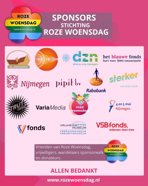 Stichting Roze Woensdag is afhankelijk van vrijwilligers, giften, donaties en sponsoring. Het zou daarom geweldig zijn als je ons als vriend wilt steunen of een donatie wil doen.