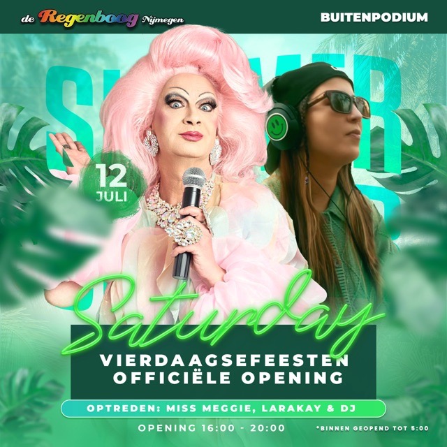 Bar de Regenboog Nijmegen start de Vierdaagsefeesten gezamenlijk met alle buitenpodia om 16:00.